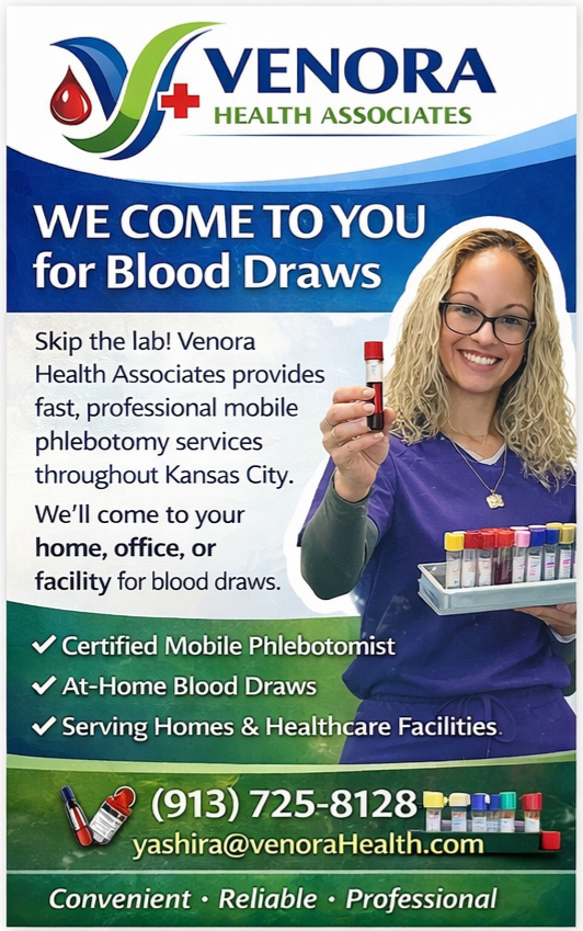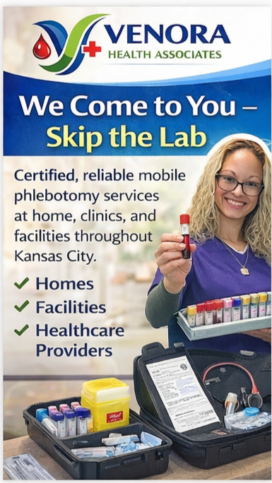 Skip the lab. Venora Health Associates provides certified mobile phlebotomy services for homes, offices, healthcare providers, and facilities throughout Kansas City.